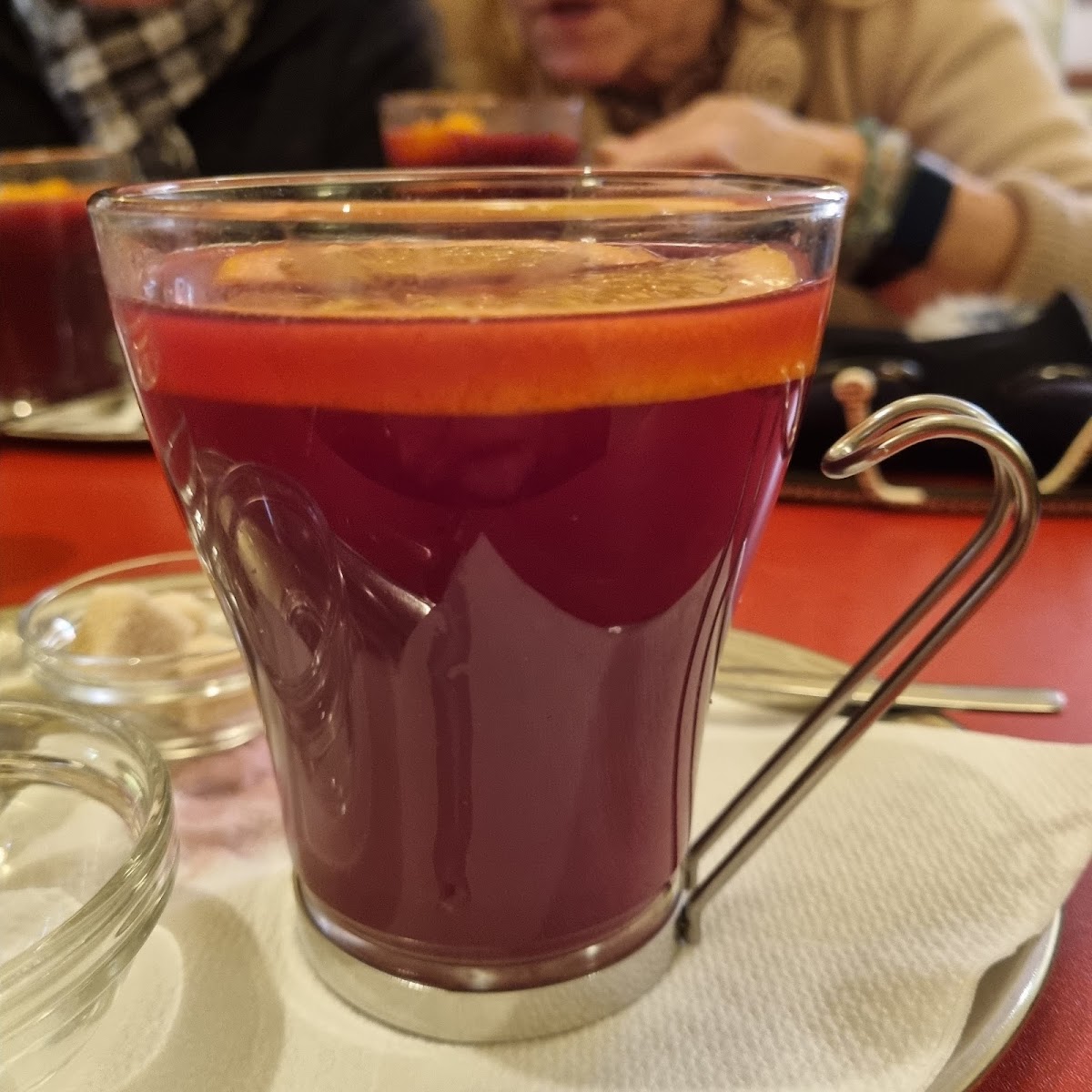One of the café's standout dishes is the Baguette with Ham, a simple yet satisfying choice that pairs perfectly with the café’s selection of hot drinks. Whether you're stopping by for a quick snack or a relaxing meal, this dish is sure to hit the spot. For those looking to enjoy something a bit more unique, the Hot White Wine is a popular choice, offering a comforting and flavorful beverage that complements the chilly weather in Vienna. Of course, no visit to Café Im Raimundhof would be complete without trying the Apfelstrudel, a classic Austrian dessert that’s always a crowd-pleaser. It’s warm, sweet, and perfectly paired with a cup of Punsch or Tea, making it a must-try on the menu.